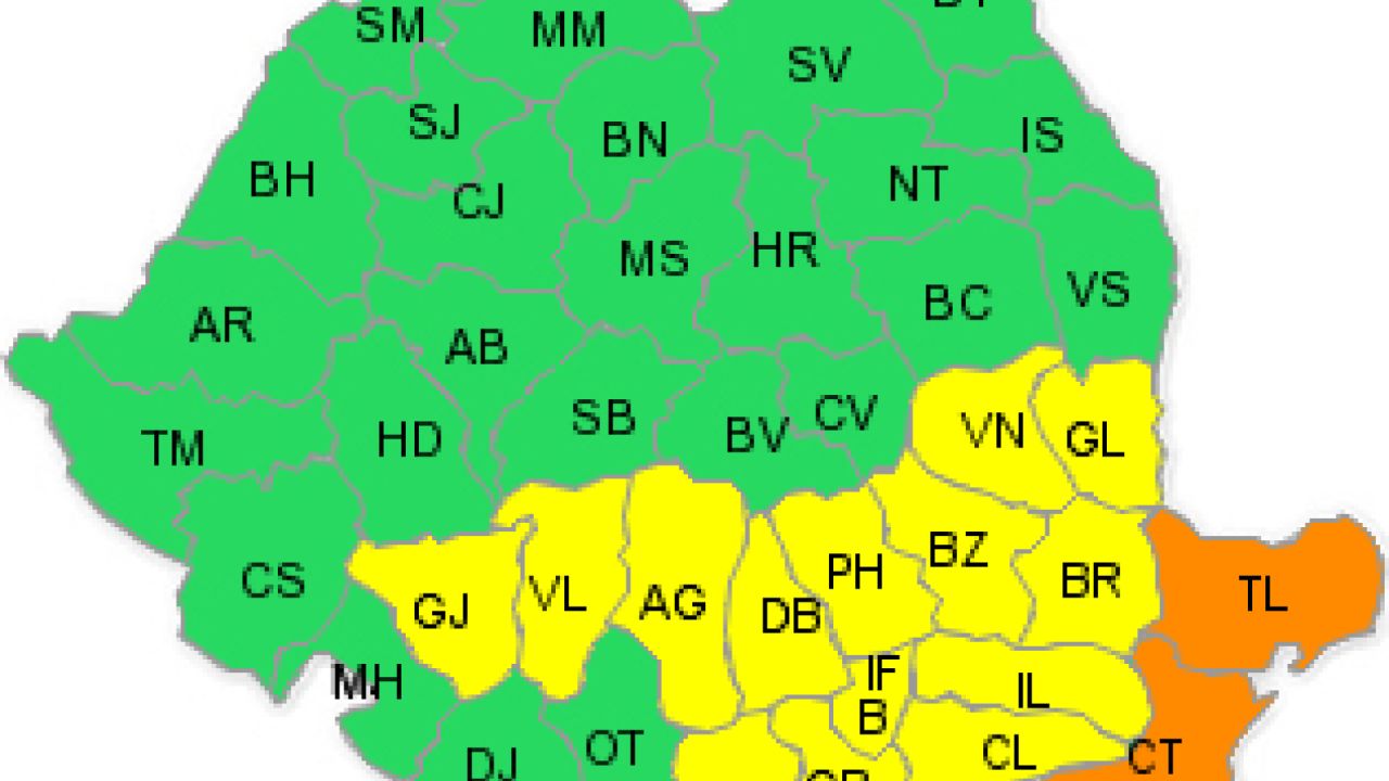 Institutul National de Hidrogologie (INHGA), care a actualizat atentionarea emisa duminica, arata ca de luni, ora 23.00, se institutie cod portocaliu pe raurile din spatiul hidrografic Dobrogea (judetele Constanta si Tulcea).