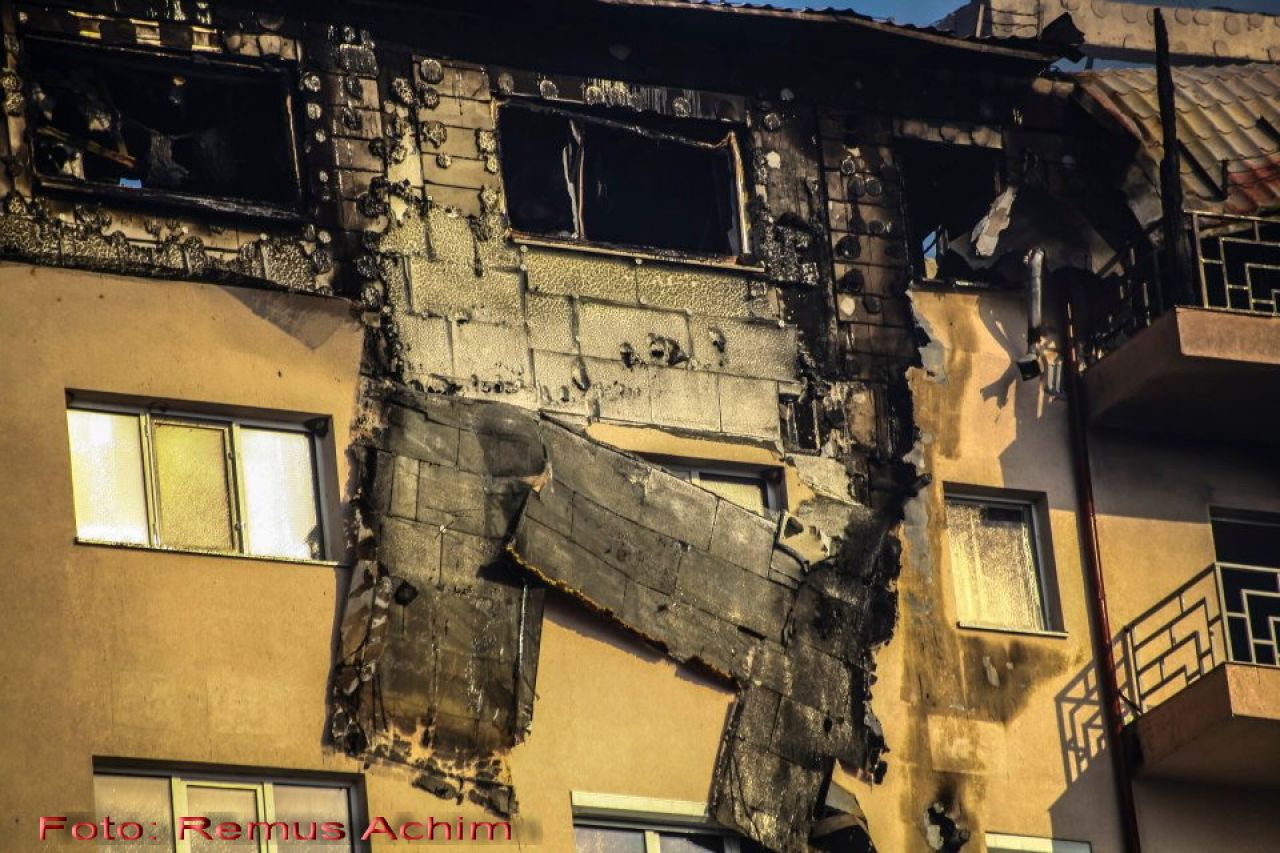 Focul a distrus etajele superioare, iar bucati din tencuiala blocului, incendiate, s-au prabusit la pamant. Unele au ajuns in balcoanele oamenilor si au declansat noi incendii.