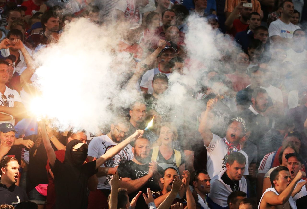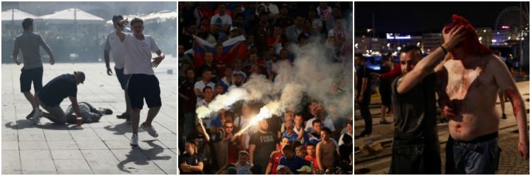 Inainte de meci, fanii rusi si englezi s-au cautat si pana la urma s-au gasit pe strazile inguste si in pietele Marsiliei. In loc sa-si sustina pasnic echipele, au distrus terasele si s-au batut cu tot ce le-a cazut in mana...scaune, sticle, chiar si o carja. Cele mai grave violente au fost in zona Portului Vechi.In disperare de cauza politia franceza a intervenit cu gaze lacrimogene si cu un tun de apa. In haosul creat un suporter a luat loc pe scaun si s-a asezat comod sa urmareasca bataile de strada. Un altul a desfacut un steag rusesc si si-a facut o poza.