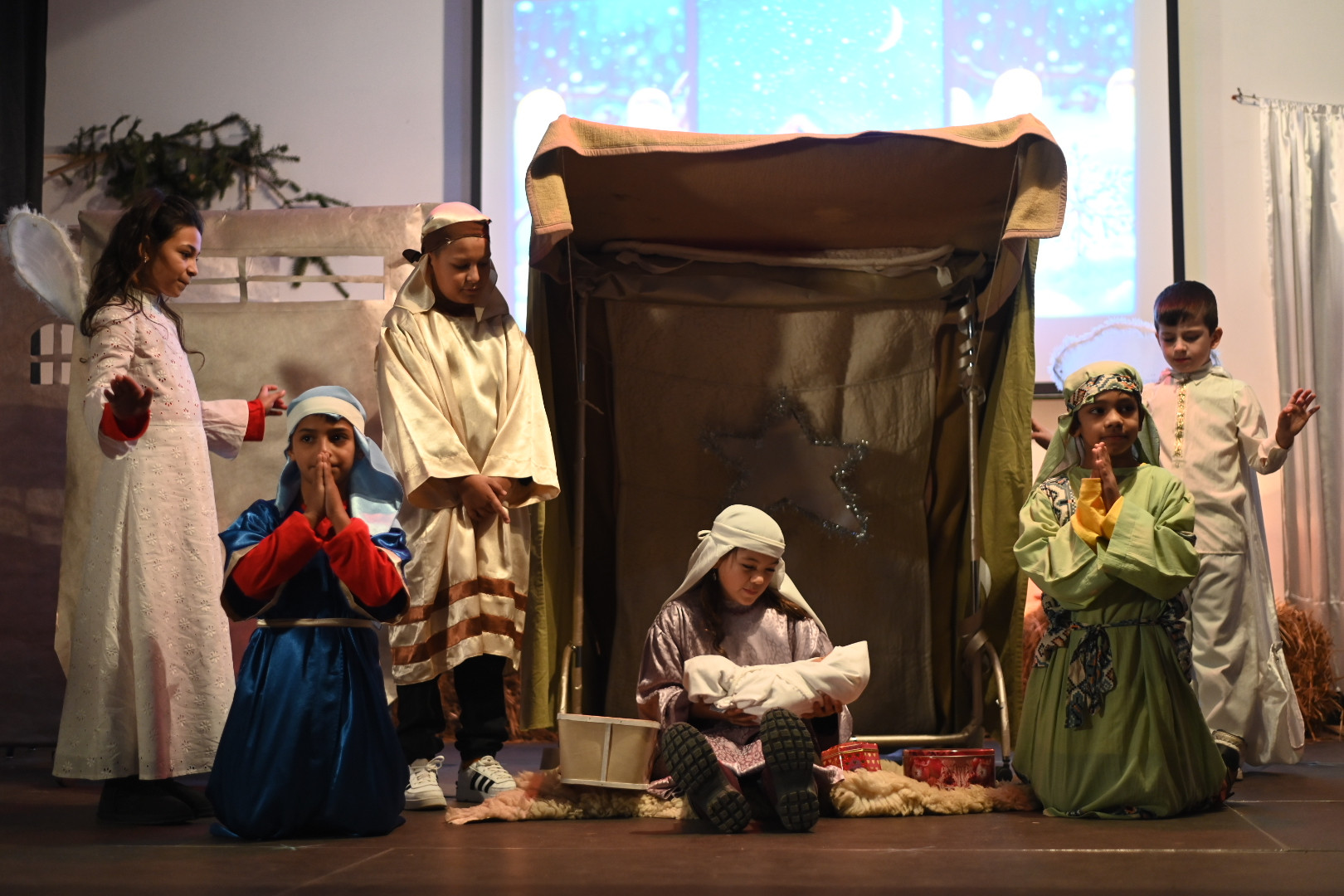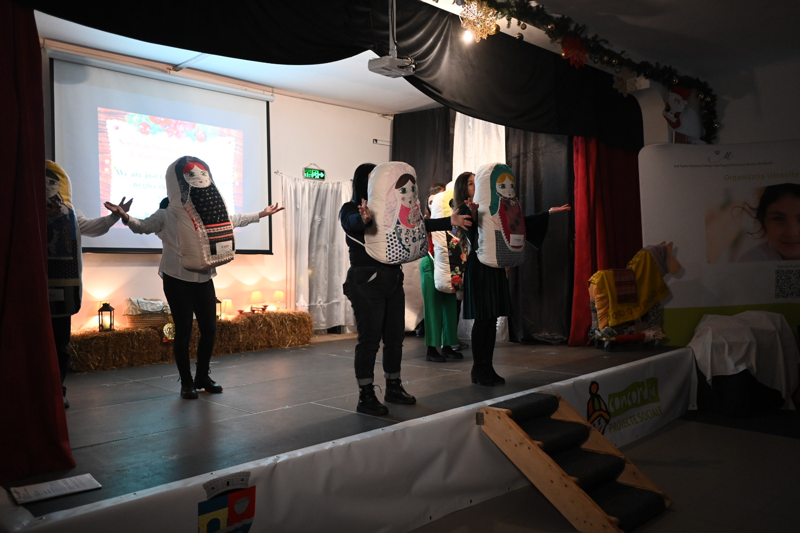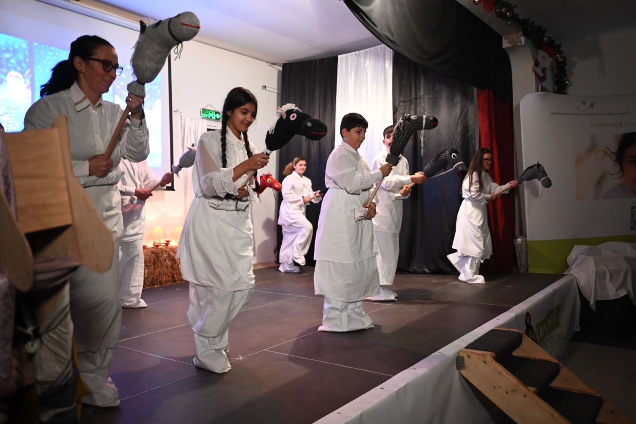 Evenimentul a adus pe scenă pe cei 36 de copii înscriși în programul nostru de intervenție în comunitate, într-un spectacol pregătit alături de echipa Centrului de Zi. Au fost momente emoționante: colinde, Dansul Căiuților și scena Nașterii Domnului. La final, toți copiii au primit cadourile pregătite din timp de Moș Crăciun și ajutoarele sale.