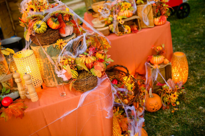 Pentru un efect spectaculos, adaugă lumini LED roşii sau mov, care vor creea atmosferă misterioasă, un photo corner cu fundal tematic şi accesorii haioase, o zonă centrală precum o masa cu dovleci şi flori de toamnă.