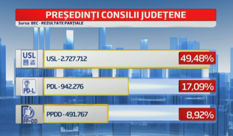 USL a obtinut 49,41 % din voturile pentru Consiliile Judetene, iar PDL a primit 17,35%, in timp ce PP-DD a primit 8,60%, potrivit rezultatelor partiale furnizate de BEC, luni, la ora 22.00, dupa numararea voturilor din 11.100 de sectii din cele 16.910.