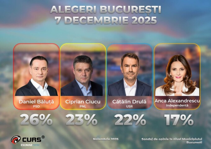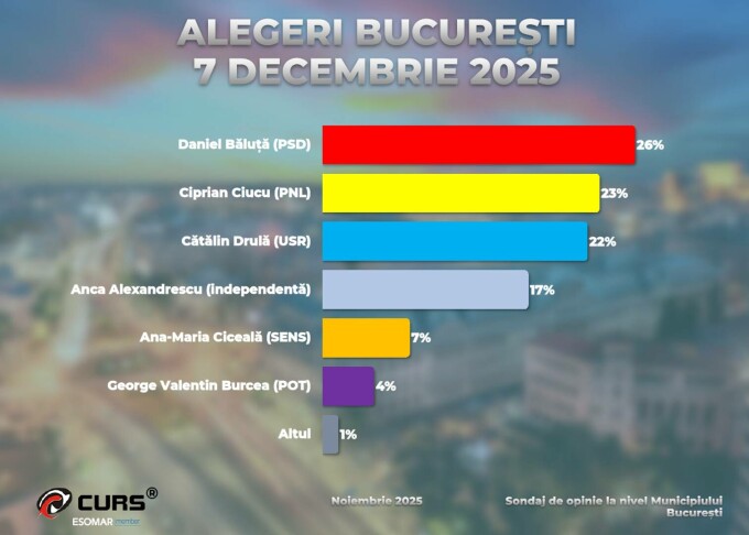 Un sondaj realizat de CURS în perioada 26–30 noiembrie 2025 arată noi date despre preferințele electorale ale bucureștenilor la viitoarele alegeri pentru Primăria Capitalei, organizate în 7 decembrie 2025.
