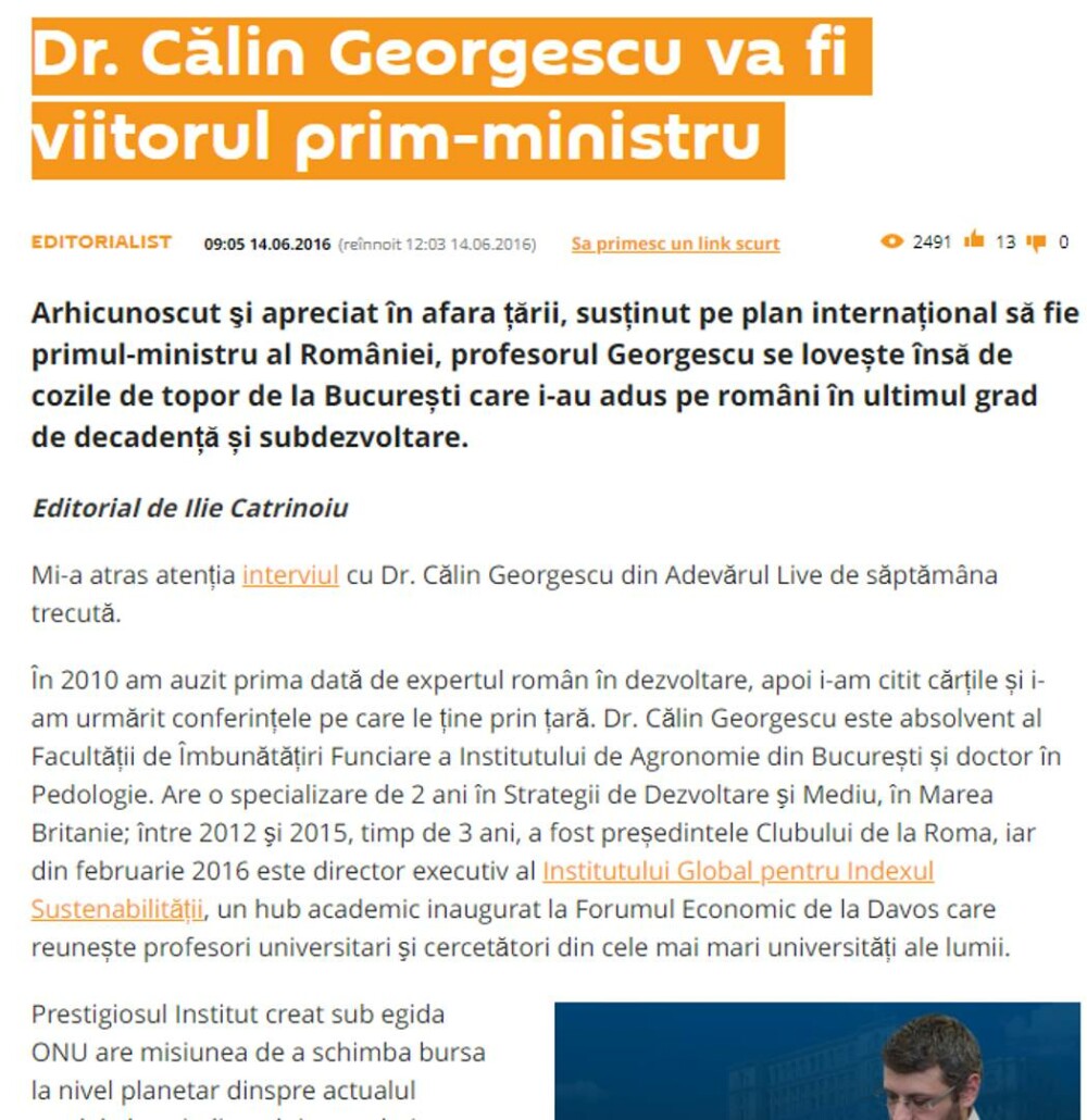 În iunie 2016, pe site-ul Sputnik.md a fost publicată o opinie laudativă la adresa lui Călin Georgescu, opinie semnată de Ilie Catrinoiu (vezi poza de mai sus).