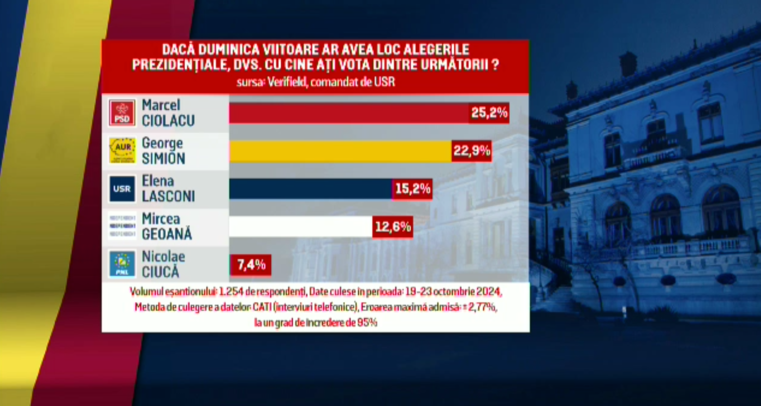 Al doilea sondaj apărut astăzi îi indică tot pe Ciolacu pe primul loc și pe Simion pe al doilea, însă pozițiile umătoare sunt schimbate. Realizat de Verifield, între 19-23 octombrie, cu aceleași metode și pe un eșantion de 1254 de oameni, sondajul o plasează pe Elena Lasconi. Urmează Mircea Geoană şi Nicolae Ciucă.