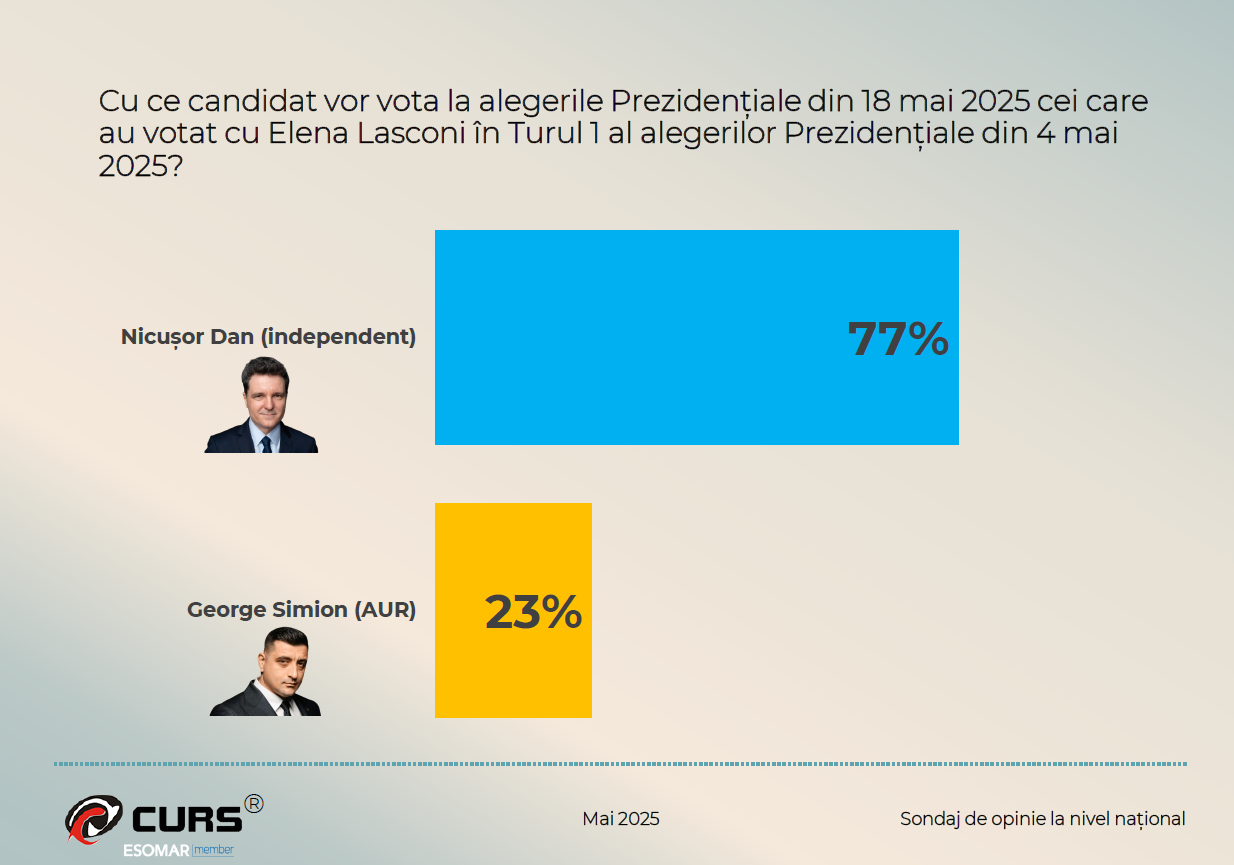 - Alegătorii Elenei Lasconi: 77% cu Nicușor Dan, 23% cu George Simion.