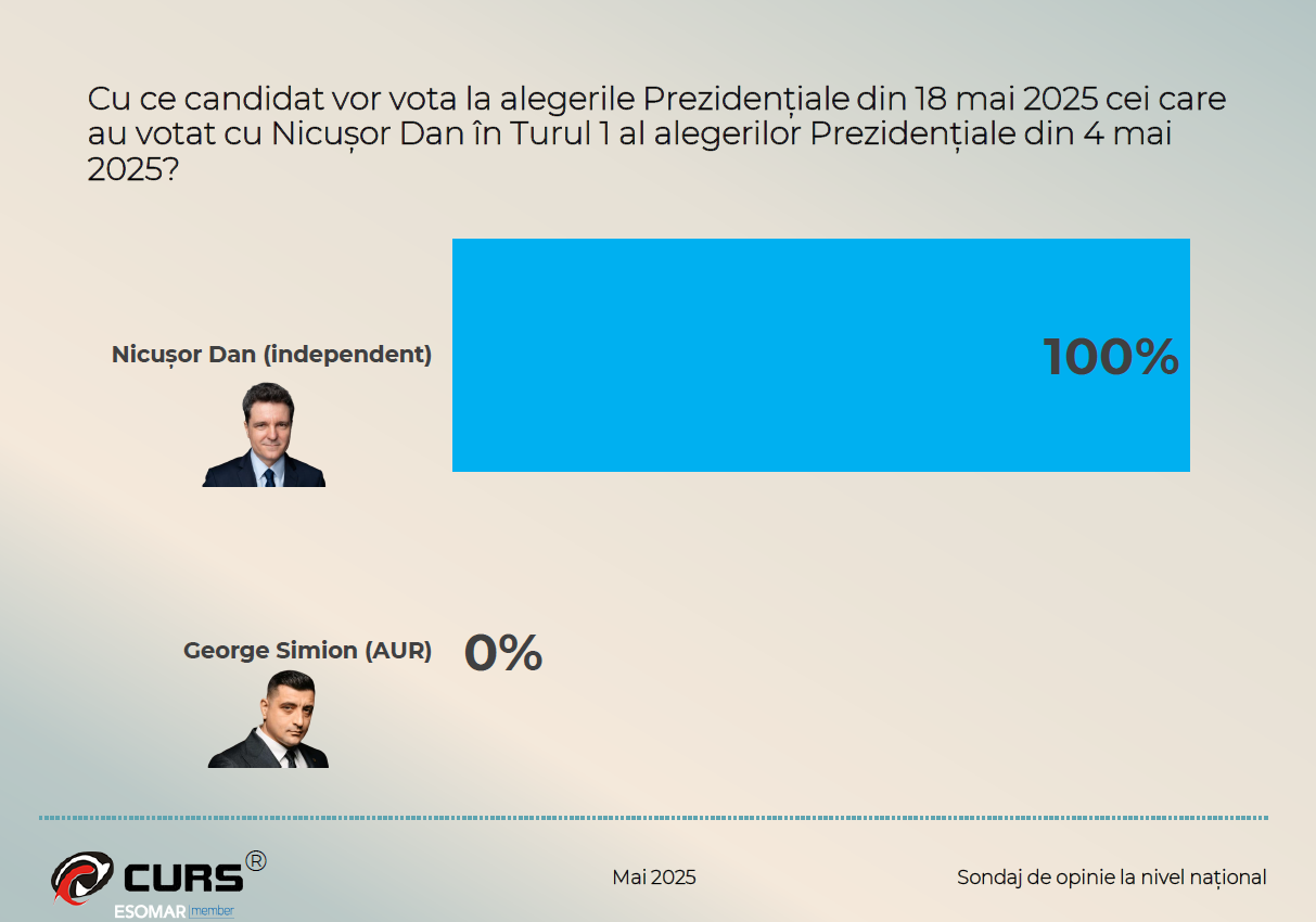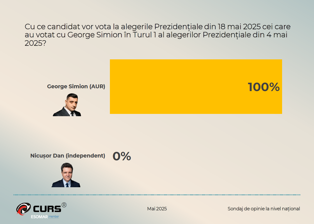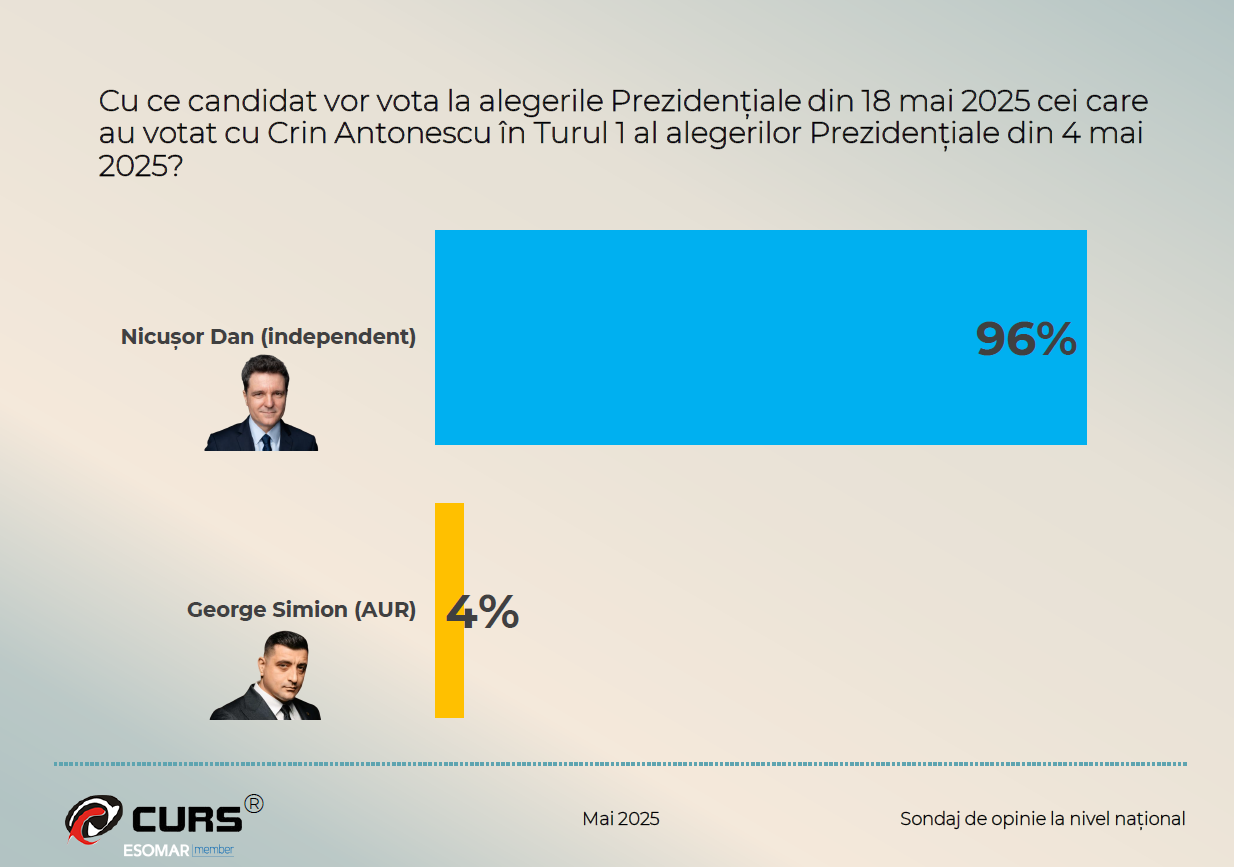 Pe de altă parte, CURS a prezentat un sondaj în care George Simion ar avea 52 de procente din voturi, în vreme ce Nicușor Dan ar obține 48%.