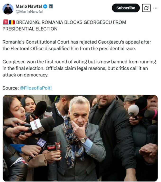Călin Georgescu a câștigat primul tur de votare, dar acum este interzis să candideze în alegerile finale. Oficialii invocă motive legale, dar criticii consideră că este un atac la adresa democrației”, a declarat Mario Nawfal într-un mesaj publicat pe platfora X.
