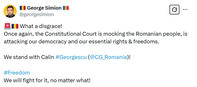 „Ce ruşine! Încă o dată, Curtea Constituţională îşi bate joc de poporul român, atacă democraţia noastră şi drepturile şi libertăţile noastre esenţiale. Suntem alături de Călin Georgescu. Libertate! Vom lupta pentru ea, orice s-ar întâmpla!”, a scris George Simion într-o postare pe platforma X, după decizia CCR privindu-l pe Călin Georgescu.