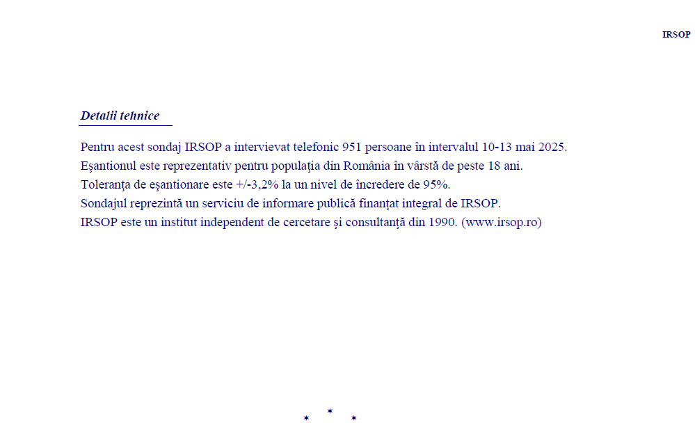 Sondajul finanțat integral de IRSOP a fost efectuat în perioada 10-13 mai 2025, prin intervieverea telefonică a 951 de persoane. Marja de eroare este 3,2%.