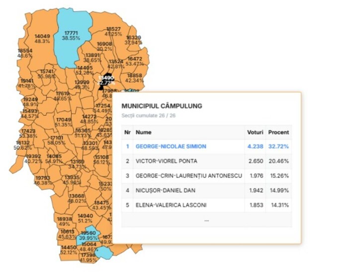 În schimb, în fruntea clasamentului se află George Simion cu 4238 de voturi (32.72 %), urmat de Victor Ponta cu 2650 de voturi (20.46 %), Crin Antonescu cu 1976 de voturi (15,26 %) și Nicușor Dan cu 1942 de voturi (14.99 %).