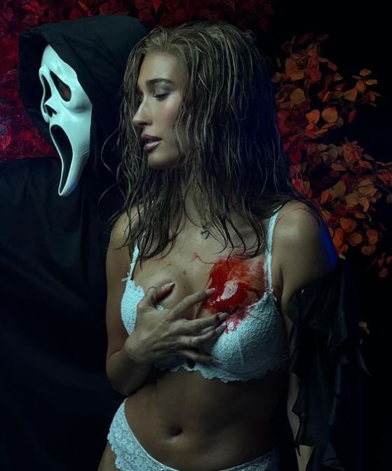 Hailey Bieber s-a dezbrăcat și a pozat în pielea lui Carmen Electra din „Scary Movie". Vedeta a reușit să întruchipeze momentele „înainte” și „după” înjunghiere.