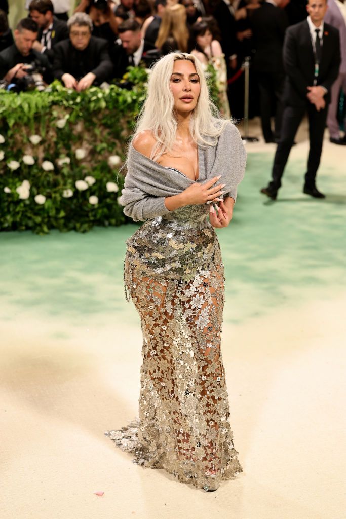 Kim a purtat la Met Gala 2024 un ansamblu argintiu Maison Margiela Artisanal by John Galliano, scrie Vanity Fair.