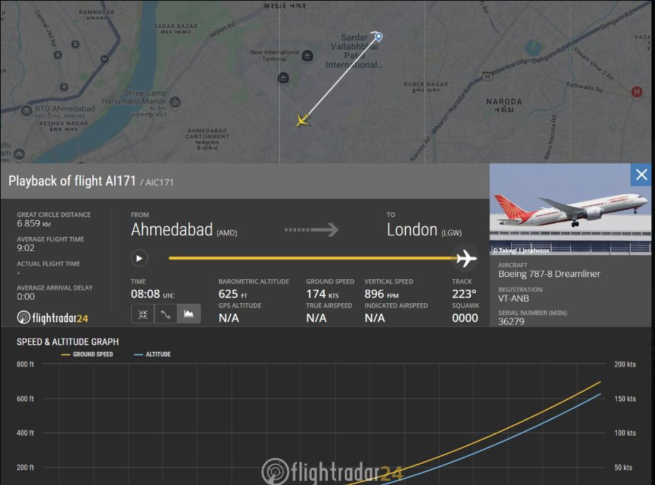 Directoratul General al Aviaţiei Civile (DGCA) a identificat aeronava ca fiind un Boeing 787 cu numărul de înmatriculare VT-ANB, care efectua zborul AI-171 cu destinaţia Londra-Gatwick. La bord se aflau 2 piloţi, 10 membri ai echipajului de cabină şi 230 de pasageri.