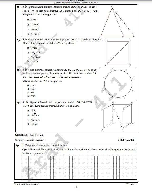 Examenul la matematică este structurat în trei subiecte. Fiecare subiect valorează 30 de puncte. Vor fi acordate 10 puncte din oficiu.
