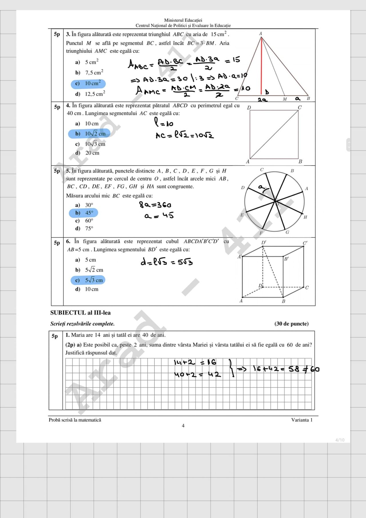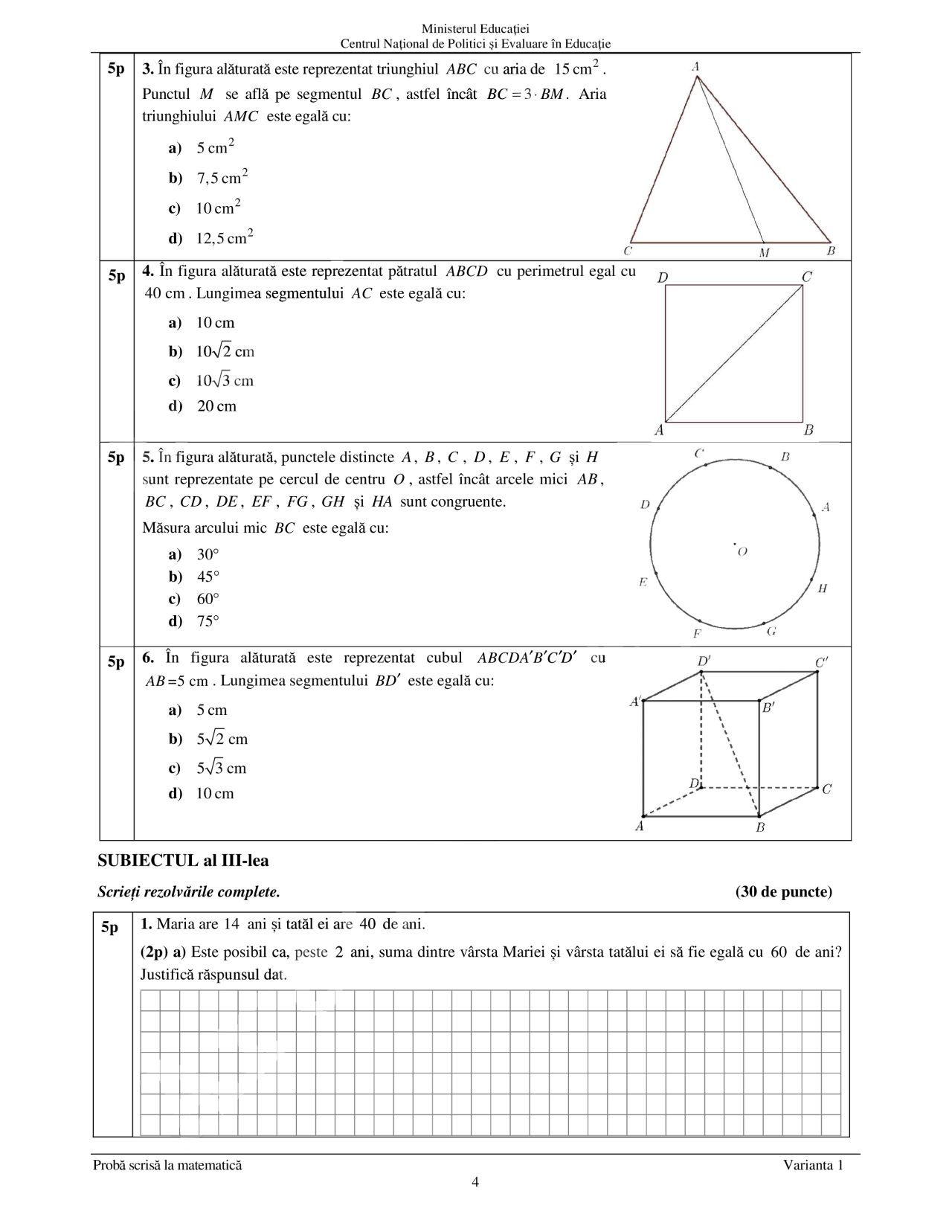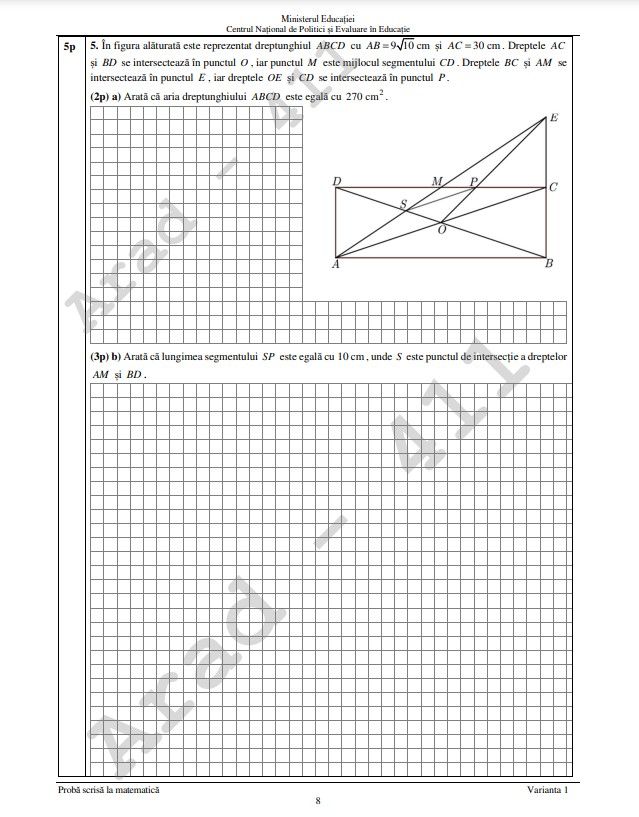 La proba de Matematică este permisă realizarea unor figuri geometrice (cu creion sau stilou/ pix de culoare albastră) în spaţiul pus la dispoziţie pentru rezolvarea problemelor.
