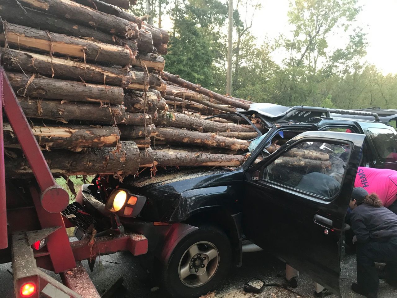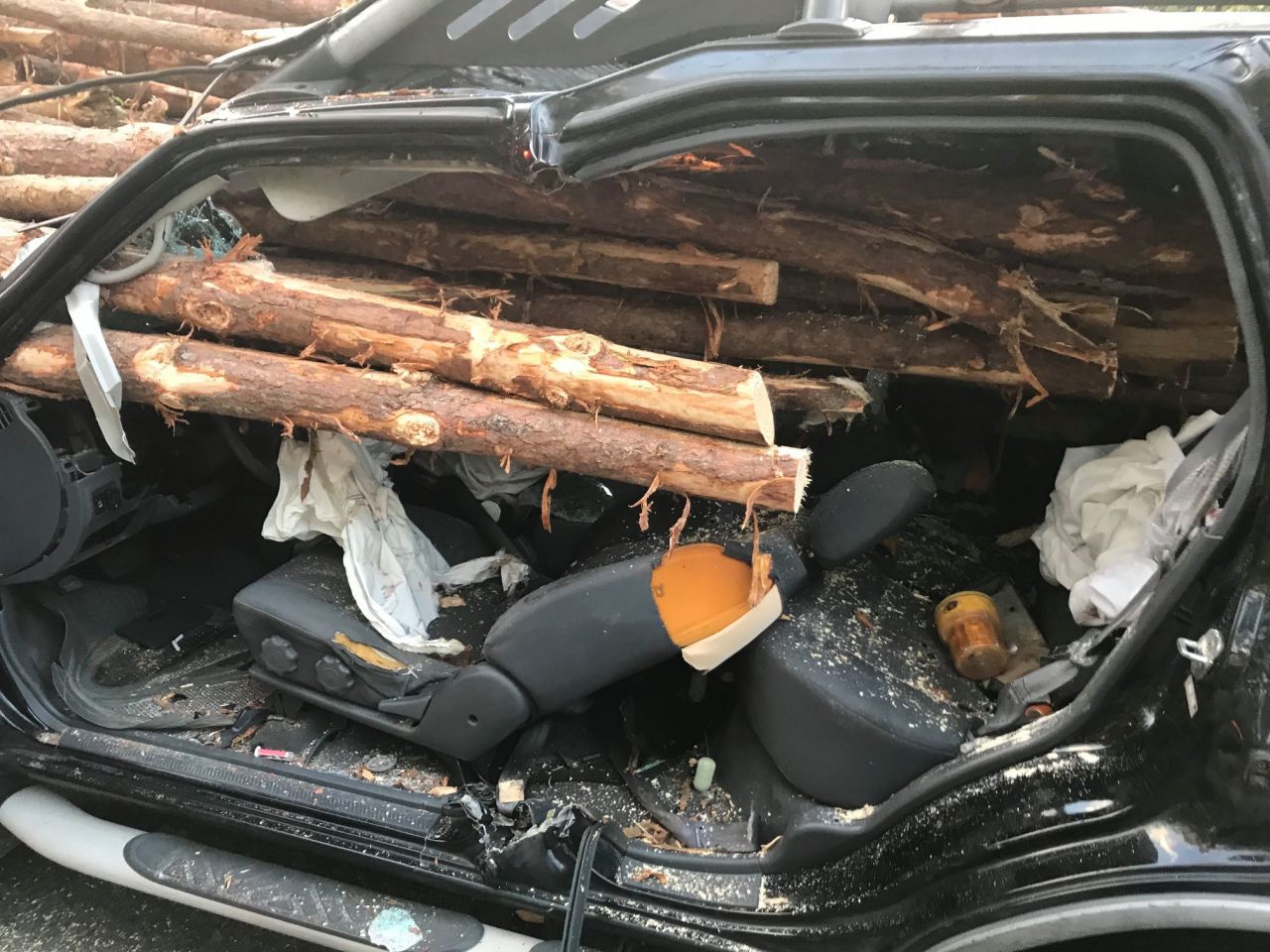 Pompierii au fost nevoiți să folosească drujbe pentru a-l elibera pe șoferul care a scăpat doar cu răni ușoare, datorită faptului că era aplecat atunci când lemnele au pătruns prin parbriz.