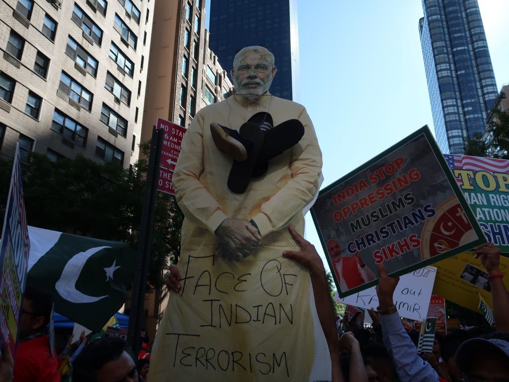 În acelaşi timp, în preajma clădirii Naţiunilor Unite, mai multe mii de protestatari s-au strâns pentru a manifesta, unii în favoarea Indiei, alţii denunţând-i activitatea în Kashmir.