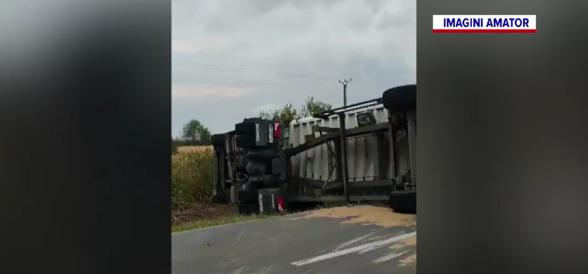 Un camion încărcat cu grâu s-a răsturnat vineri pe un drum din județul Arad. ...