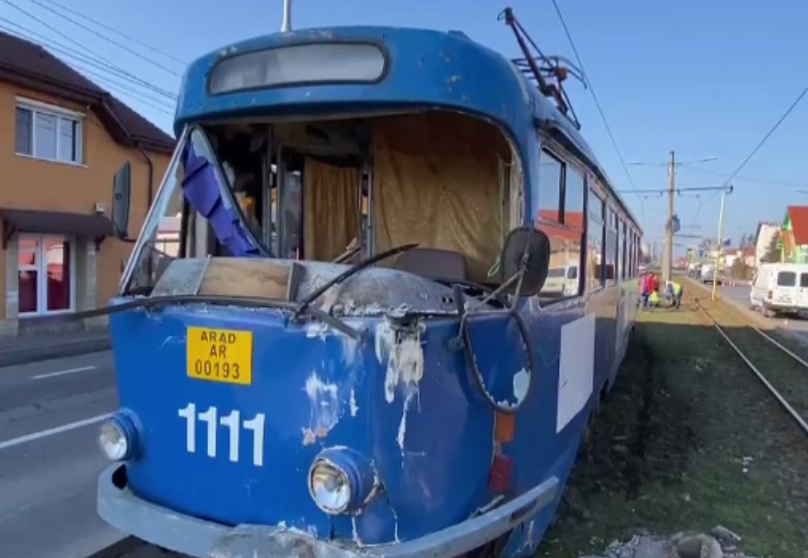 Un tramvai a deraiat luni dimineață la Arad. Vagonul a sărit de pe șine și a izbit ...