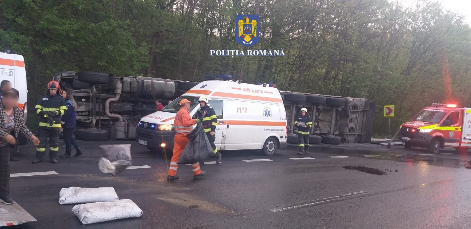 O femeie şi doi copii au fost răniţi, marți, după ce un TIR s-a răsturnat pe ...