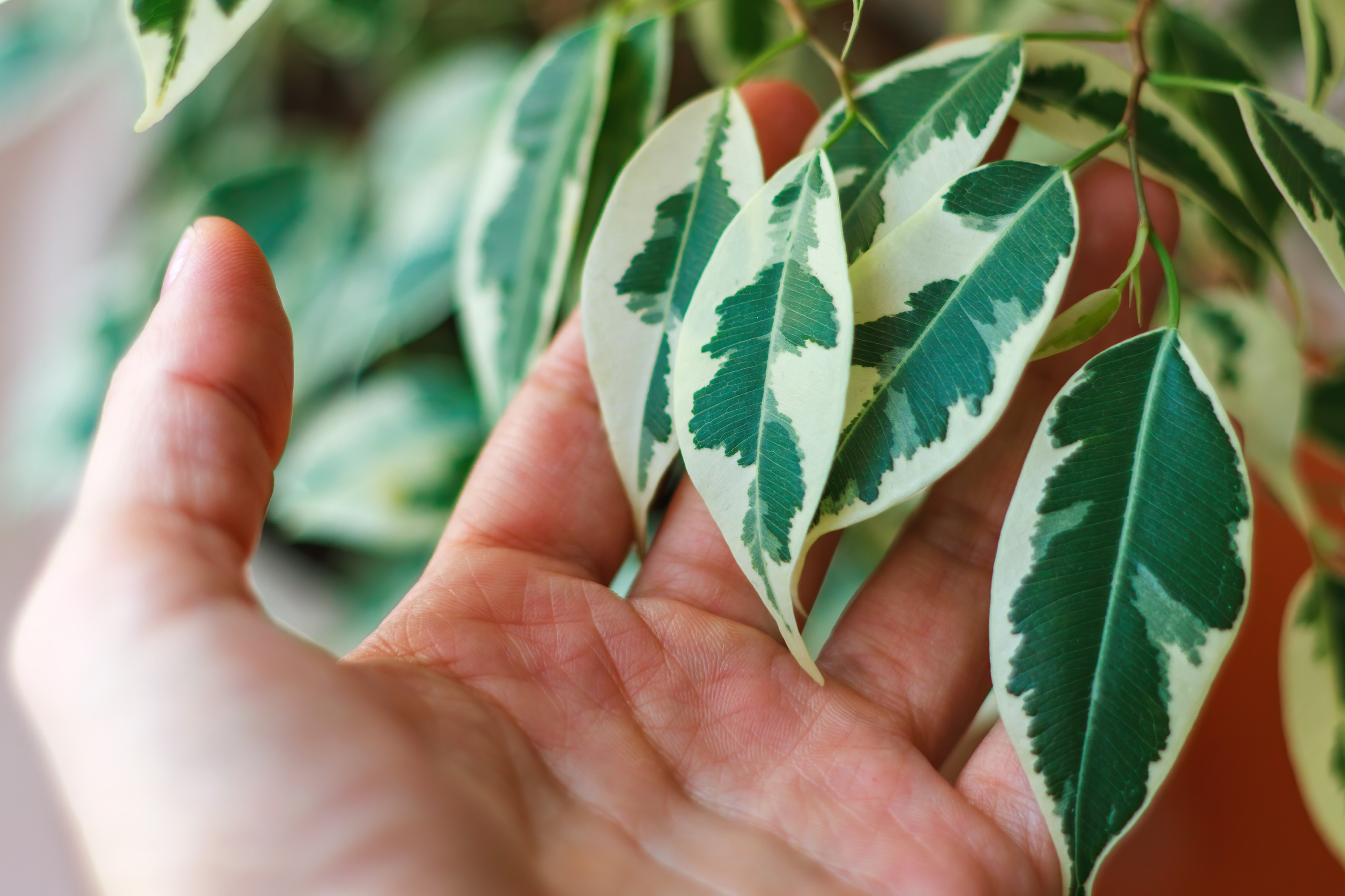 Smochinul plângător (Ficus benjamina) crește ca un arbore mare cu frunze largi și ...
