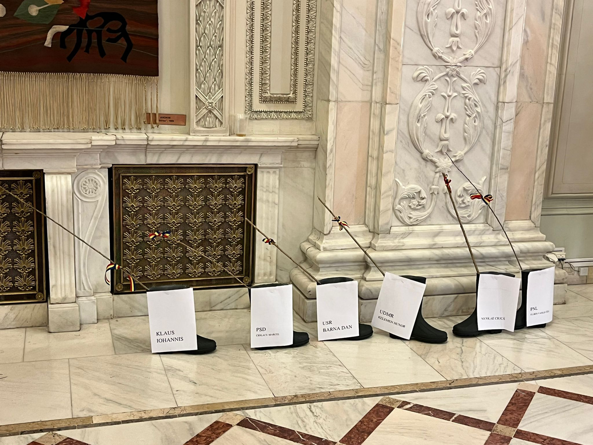 Grupul parlamentar al AUR a așezat, luni, în holul Palatului Parlamentului, mai ...