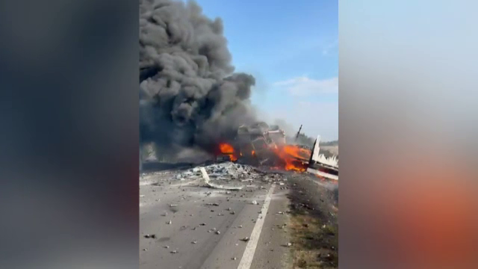 Un incendiu de proporții a izbucnit după ce un autoturism și două tiruri s-au ciocnit pe ...