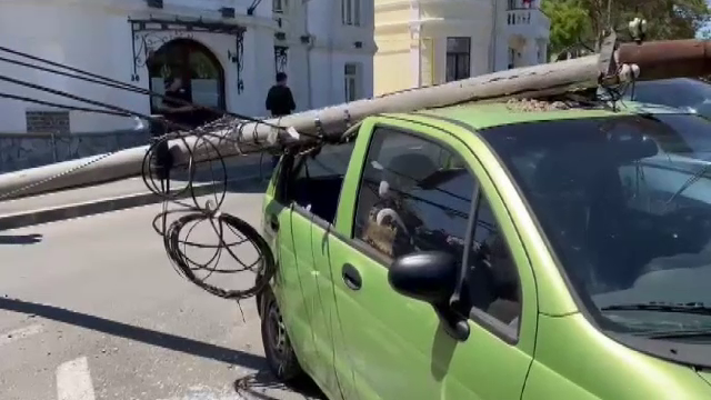 Un stâlp de electricitate, din beton, s-a prăbușit peste o mașină, într-o ...