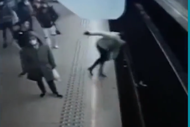 Momentul în care un bărbat împinge o femeie de pe peron în fața ...