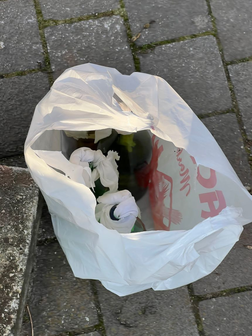O sacoşă cu mai multe sticle ce par a fi cocktailuri explozive, de tip Molotov, a fost ...