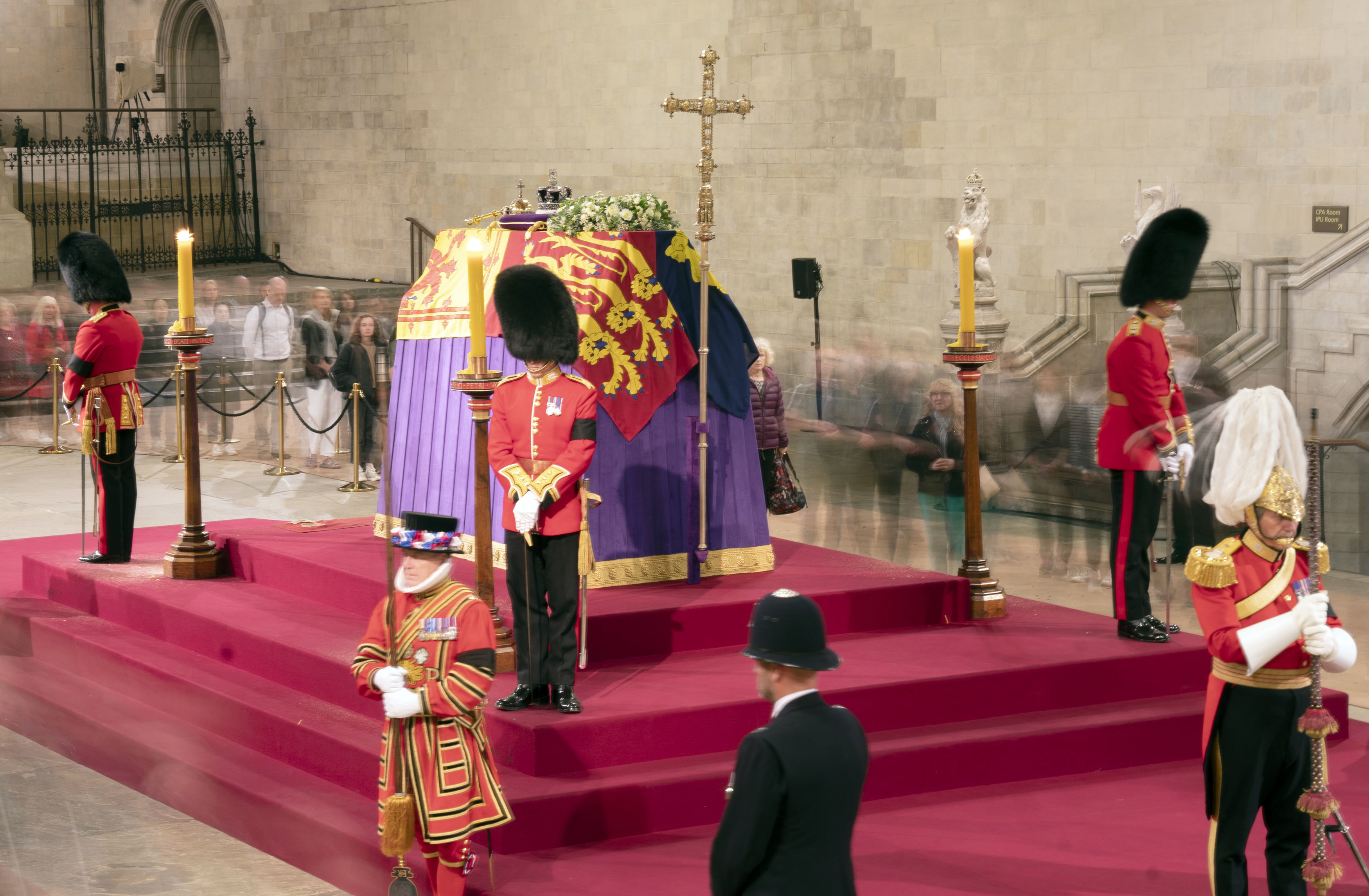După ceremonia religioasă de la Westminster Abbey, sicriul reginei Elisabeta a II-a a ...