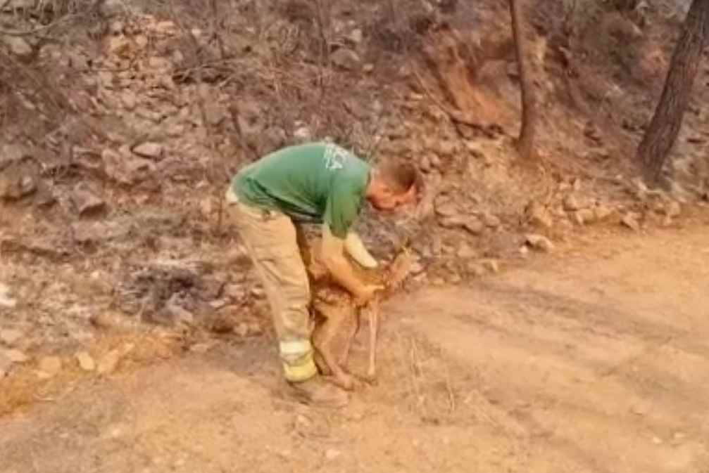 Pompierii spanioli au salvat un pui de căprioară din flăcările care au cuprins hectare ...