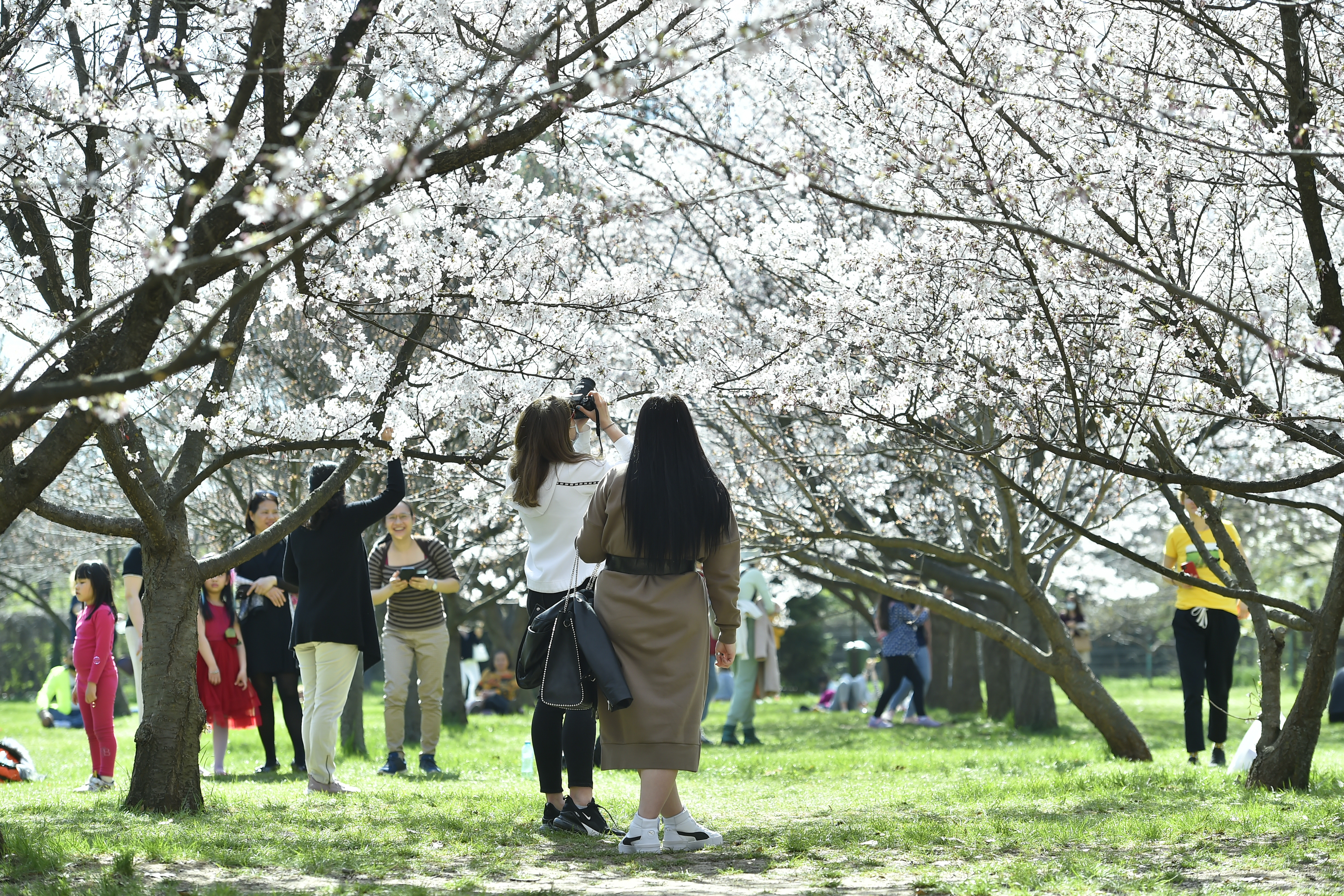 Mai multe persoane se plimbă printre copacii înfloriți din Grădina Japoneză din ...