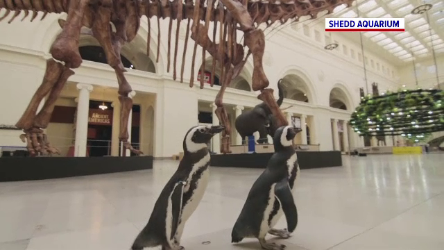 Doi pinguini intră într-un muzeu de istorie a naturii.