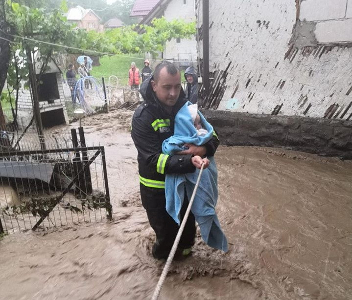 Un pompier fotografiat cu un bebeluş în braţe, la inundaţiile din Rodna, judeţul ...