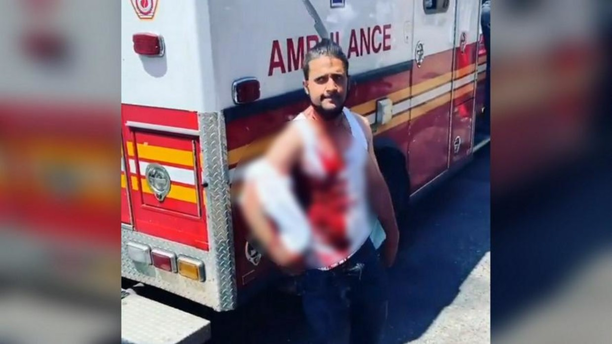 Imagini șocante cu un bărbat care merge pe o stradă din New York cu un cuțit uriaș ...