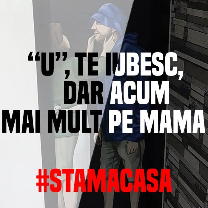 Mesajul „Stăm în casă. Familia contează", afișat la geamul unui ...