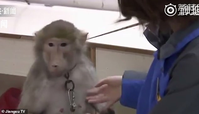 O maimuță dintr-o grădină zoologică din Thailanda este forțată să ridice greutăți, să ...