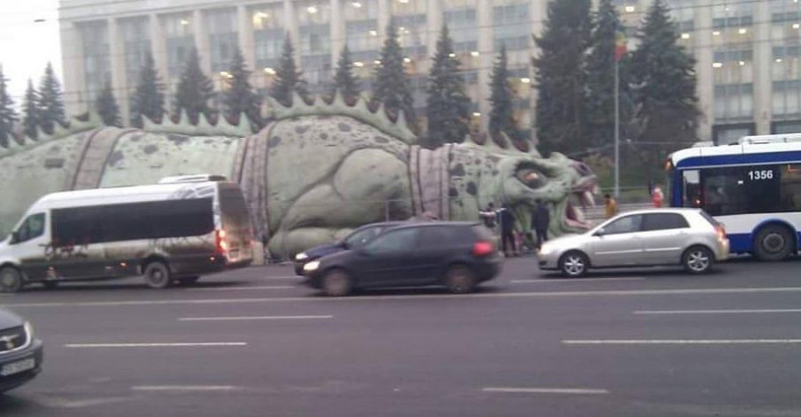O şopârlă uriaşă amplasată de angajații primăriei din Chișinău în Piața Marii ...