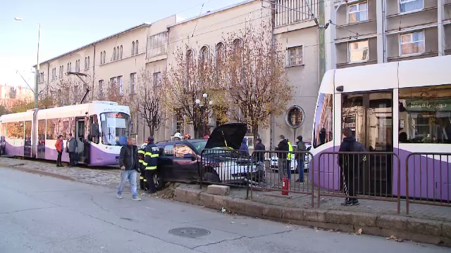 Impact violent joi, la prânz, între un autoturism şi un tramvai din Timişoara.
