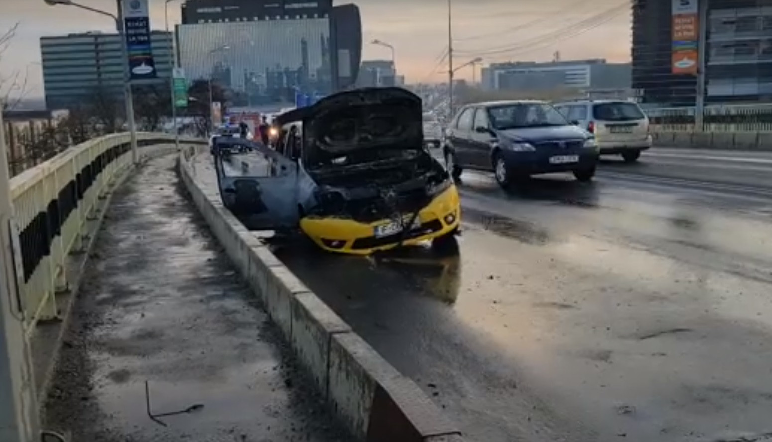 Un taxi a izbucnit în flăcări, miercuri dimineață, pe podul Pipera din Capitală, ...