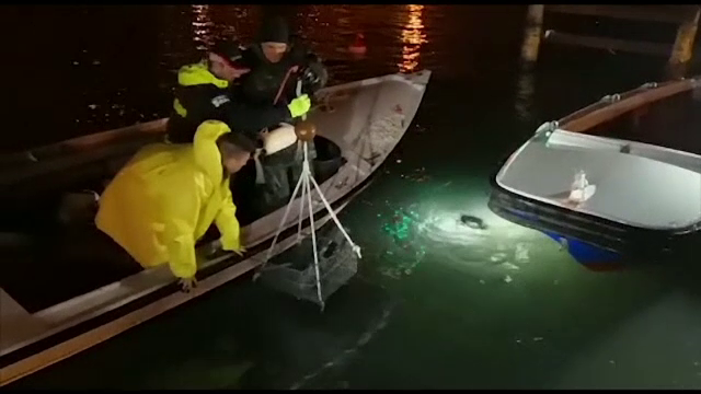 Pentru câteva ore, gondolierii din Veneţia au îmbrăcat costume de scafandri. ...