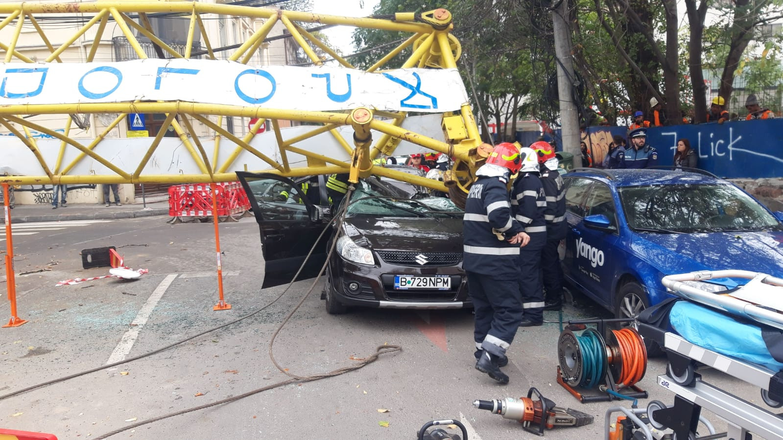 Braţul unei macarale s-a prăbuşit sâmbătă peste un autoturism în care se ...