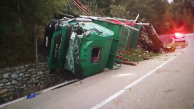 Un camion încarcat cu lemne s-a răsturnat într-un şanţ între Novaci şi ...