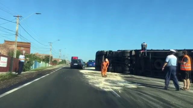Un şofer de TIR, care transporta piese auto s-a răsturnat cu maşina, la ieşirea din Turda ...