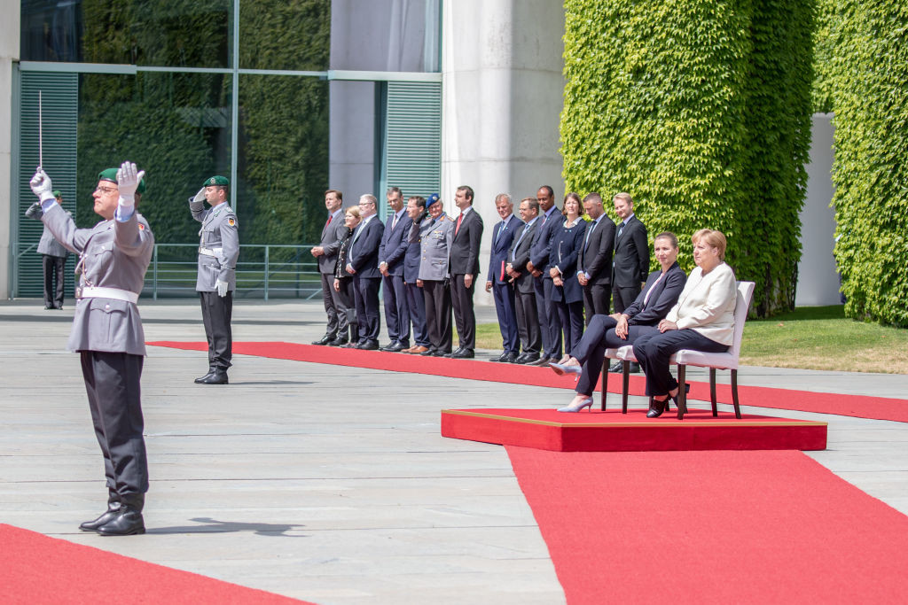 Cancelarul german Angela Merkel a stat aşezată joi în timpul ceremoniei de primire ...