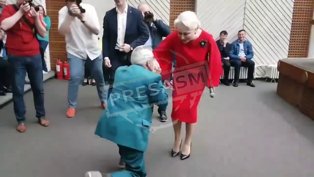 Un bărbat s-a pus în genunchi în fața Vioricăi Dăncilă în Satu Mare și i-a făcut o declarație. VIDEO