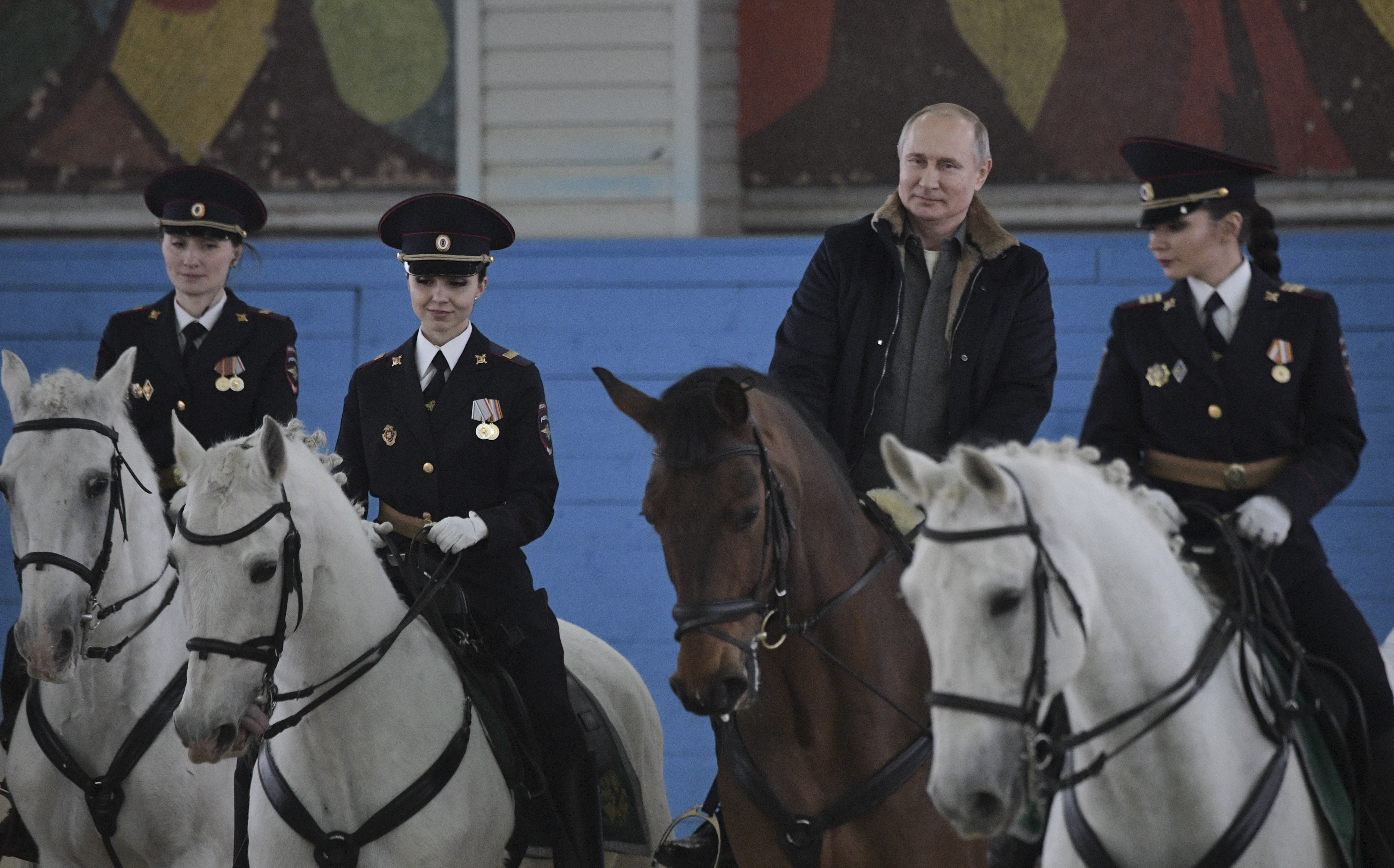Vladimir Putin a apărut joi călare, înconjurat de poliţiste, în ajunul Zilei ...