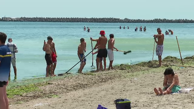 Plajele din Mamaia și Constanța au fost invadate de alge. Intrarea în apă este ...